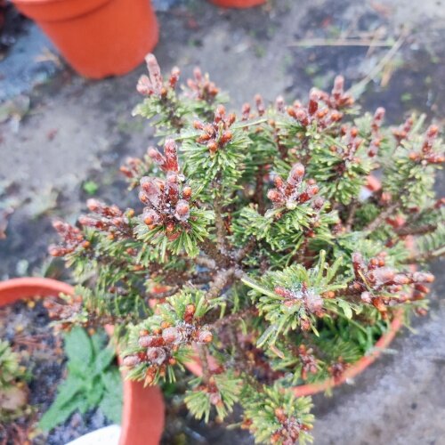 Zakrpatená borovica s kompaktným rastom, pologuľovitého až vankúšovitého tvaru. Ihlice rastú vo zväzkoch po dvoch, silne skrátené, 10-15 mm dlhé, sýto zelené, mierne prehnuté. Púčiky výrazné červenooranžové. Ročný prírastok je 3-5 cm, rastlina dosahuje v 20. roku výšky 0,2-0,4 ma šírky 0,2-0,5 m. Mrazuvzdorná do - 45 ° C.
