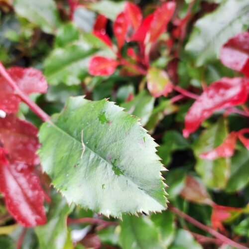 Corallina' - vždyzelený hustý ker, vhodný pre živé ploty. Rastie vzpriamene aj do šírky a dorastá sa 3 - 5 m. Je pomerne rýchlo rastúci, v mladom veku po dosiahnutí výšky 150 cm, svoj rast spomalí a samovoľne zahusťuje do nepriepustného kríka. V priebehu apríla a mája nakvitá drobnými, krémovými kvetmi, ktoré sú usporiadané v latách. Jej listy majú nápadne pílovitý okraj, sú mierne zvlnené. Sú oválne až široko elipčité, zjari rašia žiarivo červeno a približne za mesiac zozelenajú do stredne zelenej farby. Koncom leta pučia prirodzene druhýkrát a tentoraz už majú nové listy tmavší odtieň červené. Prírastky sú 20-30 cm za rok.